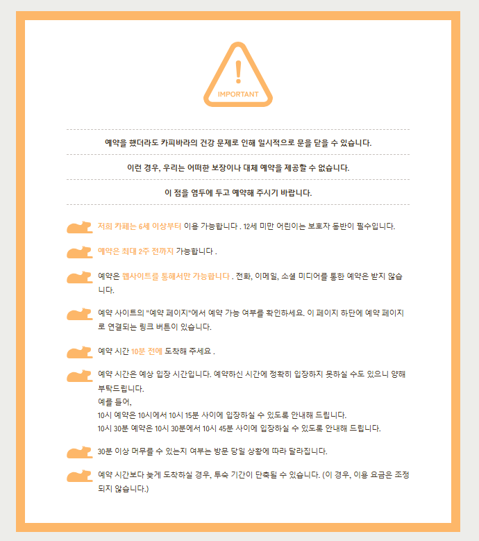 - 주의: 카피바라 컨디션에 따라 당일 휴무할 수 있음 (환불·대체 예약 불가)