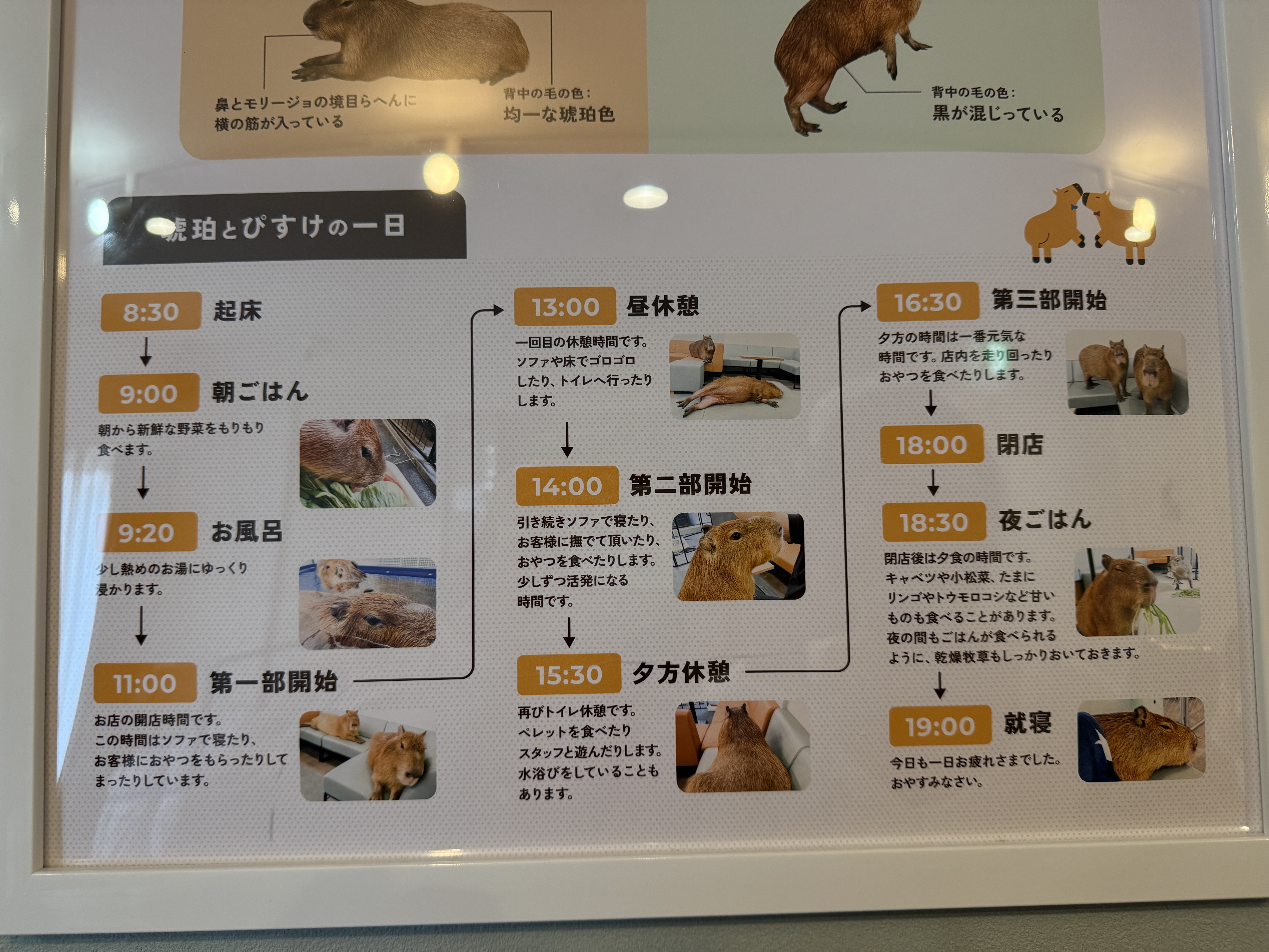 벽에는 카페에 있는 카비바라 두마리의 정보랑 일정이 적혀있는데